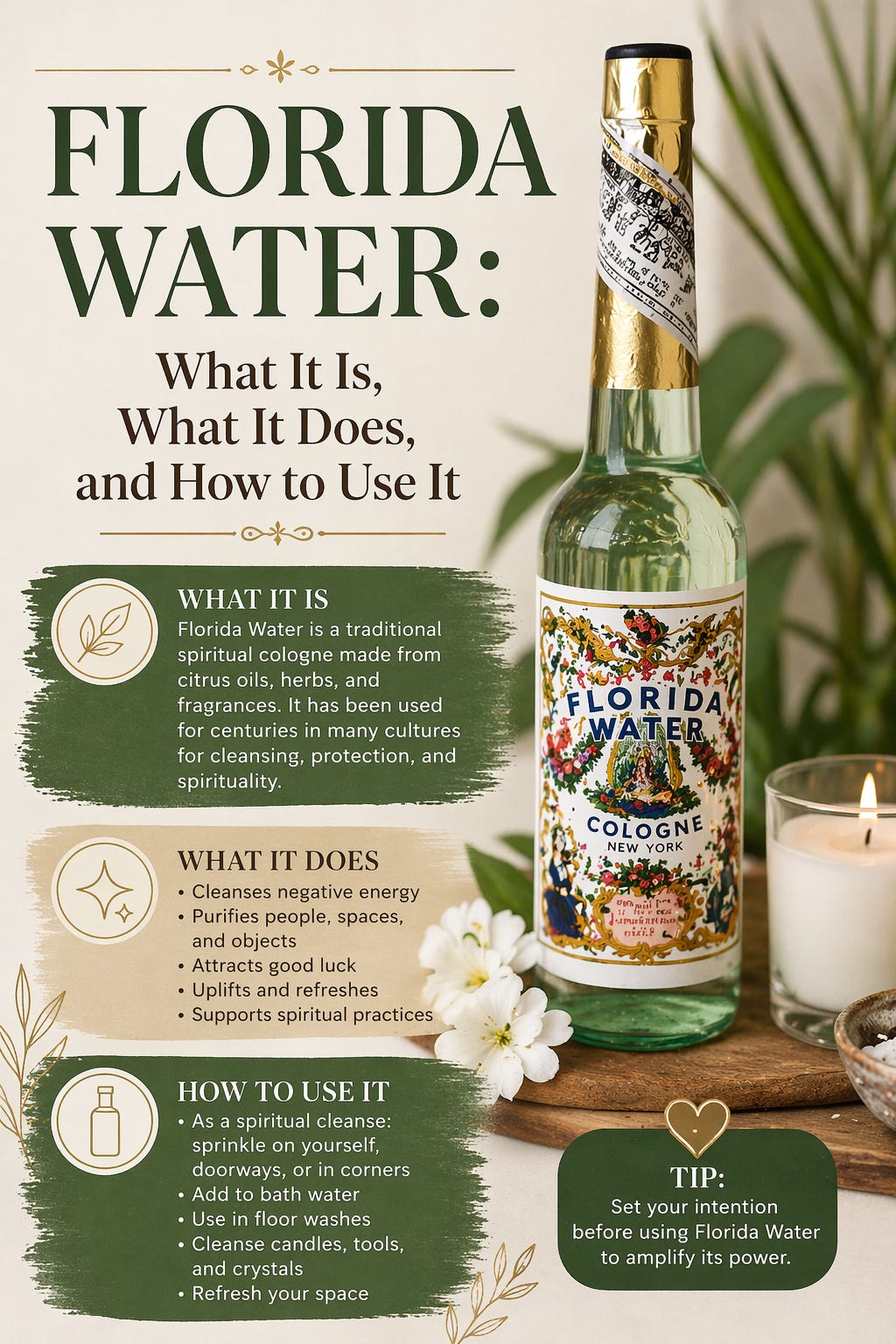 Florida Water is a tool, and like all tools, it is most effective in the hands of someone who understands what they are doing with it and why. If you are new to spiritual practice and feel drawn to working with Florida Water, let that curiosity lead you toward learning more about the traditions it comes from rather than treating it as a standalone solution.