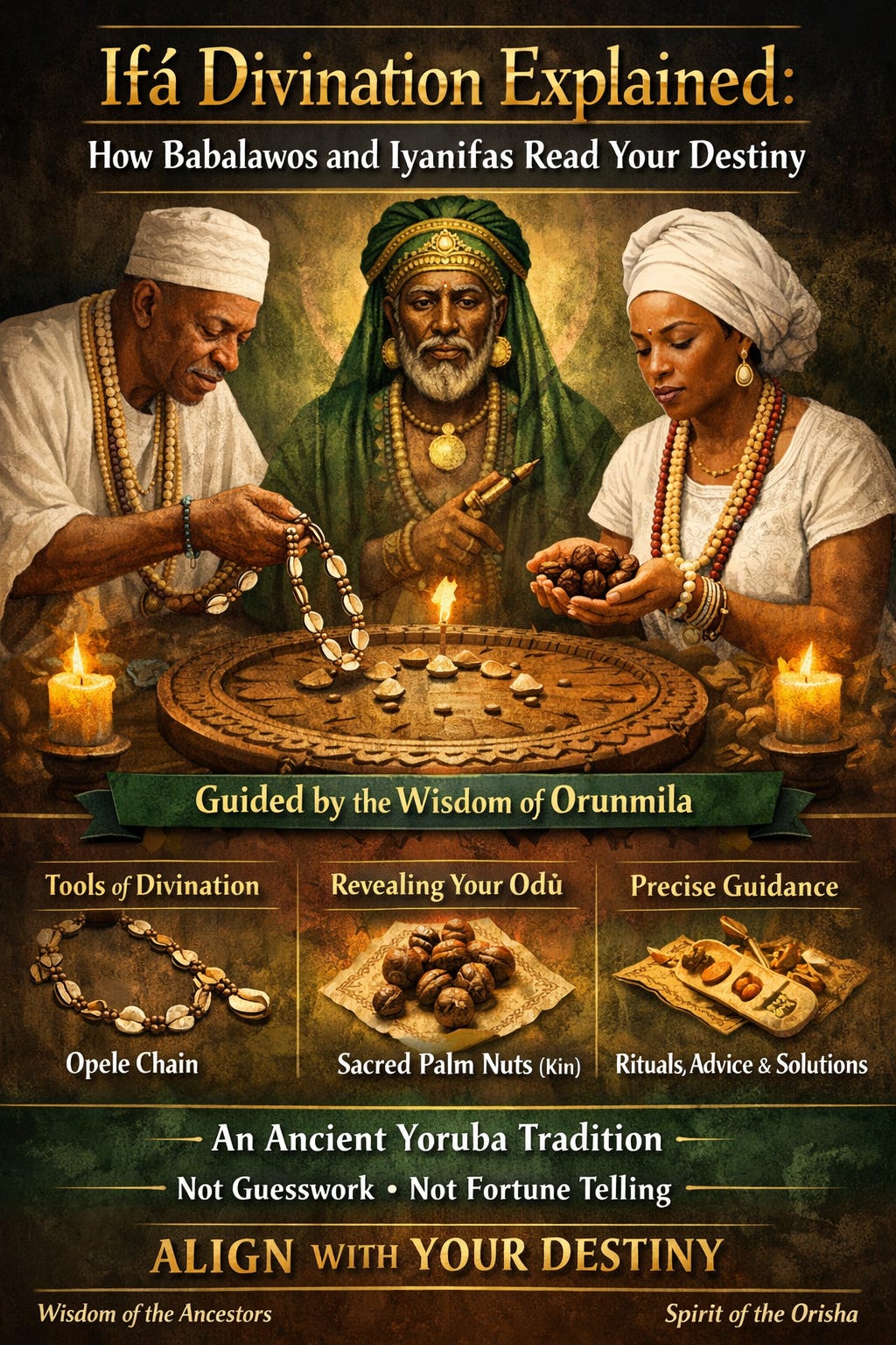 Ifá is not simply a divination system, though divination is central to it. It is a complete spiritual and philosophical tradition originating from the Yoruba people of West Africa, specifically from what is now southwestern Nigeria. At its heart is Orunmila, the Orisha of wisdom and divination, who is understood to have witnessed the destiny each soul chose before entering this world. Orunmila does not predict the future in the way a fortune teller might. He reveals what is already true: the shape of a person’s path, the forces working for and against them, and what is needed to move in alignment with their destiny rather than against it.