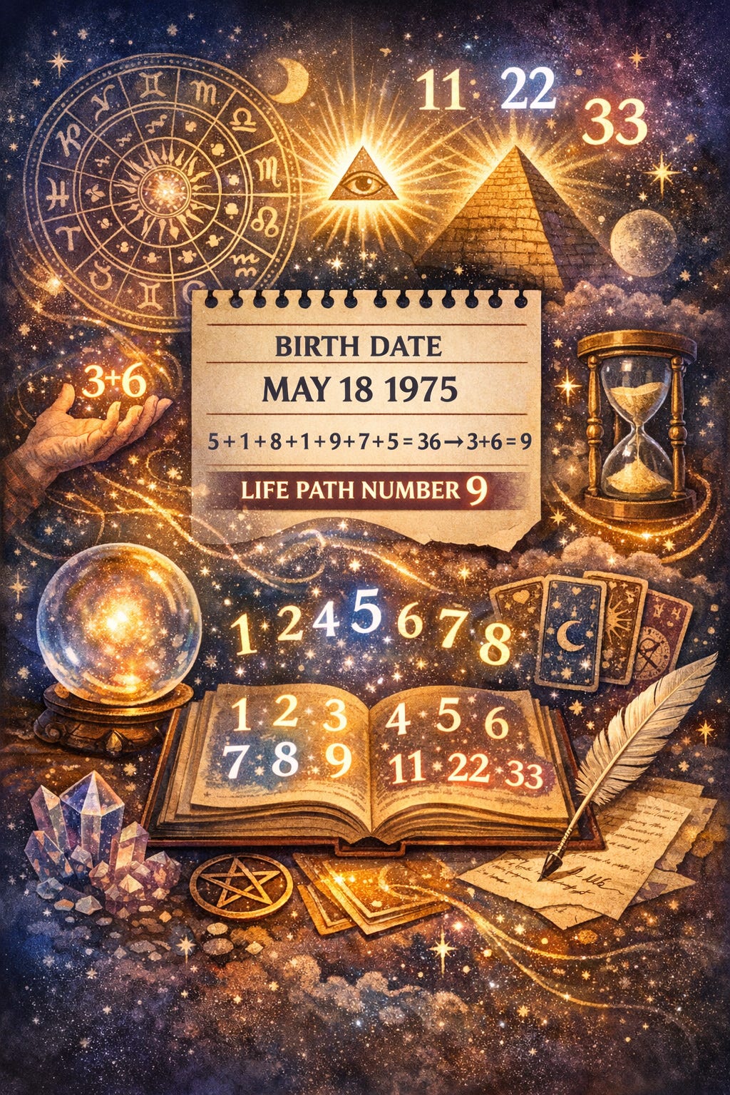 Write out every digit of your full birth date individually and add them all together in a single line. Keep reducing until you land on a single digit. May 18, 1975 becomes 5+1+8+1+9+7+5, which equals 36. Add 3 and 6 and you get 9. That person’s Life Path number is 9.