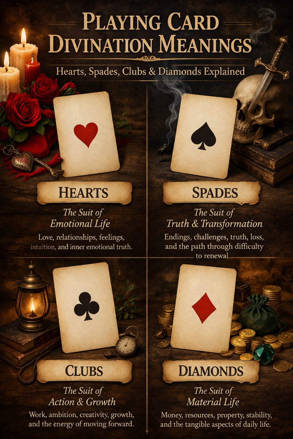 Cartomancy is the art of reading a standard 52-card playing deck for insight and guidance. Like Tarot, it is a system of symbols. Unlike Tarot, those symbols are embedded in something most people have already held in their hands without realizing what they were holding. Each of the four suits carries its own domain of life, its own emotional register, and its own territory of concern. Learning those domains is where every cartomancy practice begins.