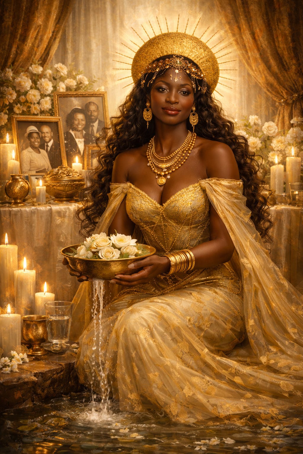 Oshun of Ancestors speaks to inherited sweetness, inherited resilience, and inherited standards. Remember that your success did not begin with you. You are carrying prayers that were once whispered in survival.