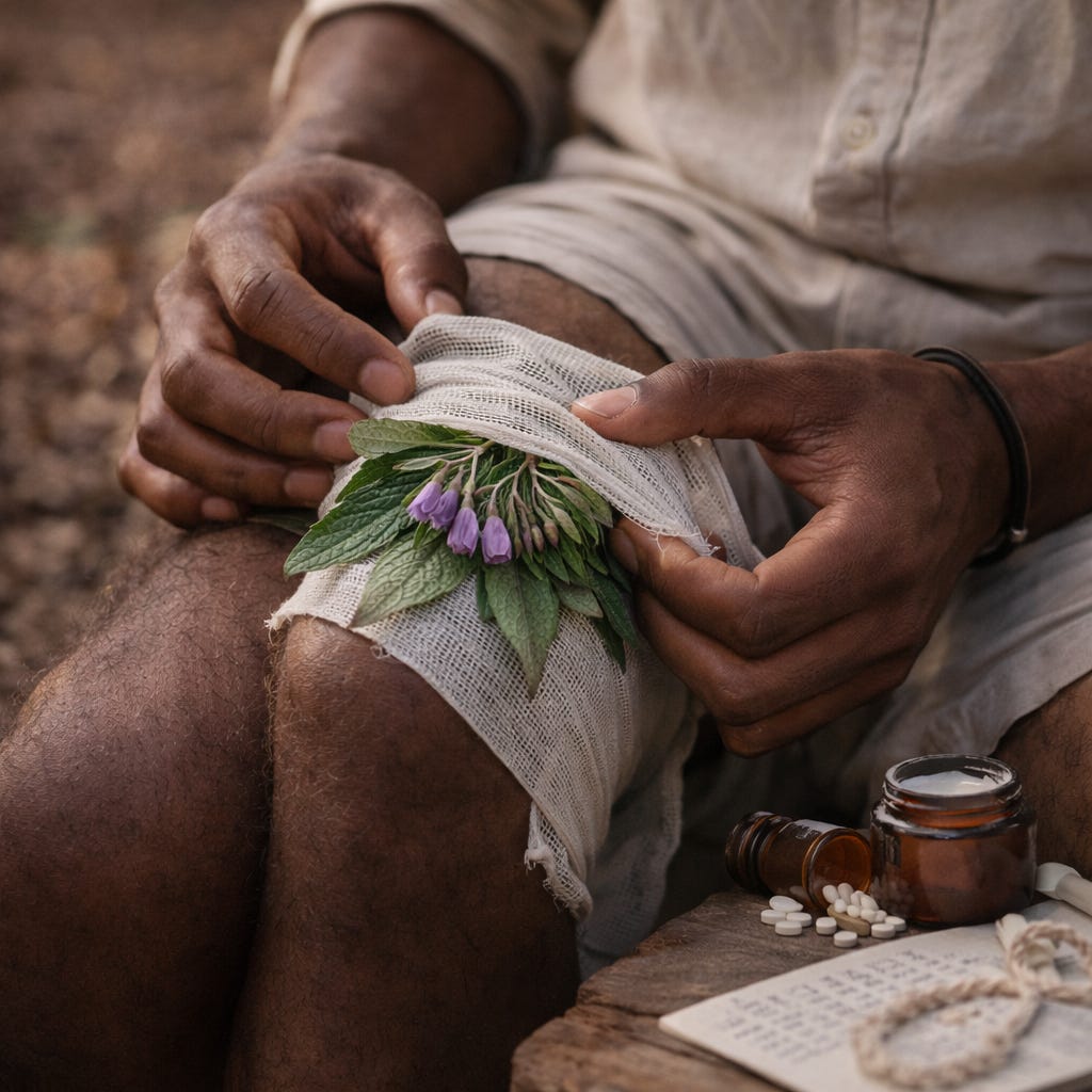 Comfrey earns its name. Healers have called it boneset for centuries because it does not just soothe: it goes into the break and works to mend it from the inside. That is today’s instruction.