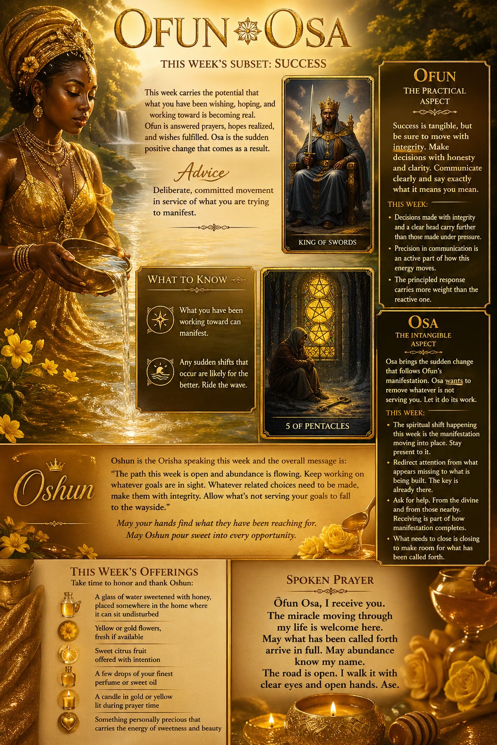 Oshun is the Orisha speaking this week and the overall message is: “The path this week is open and abundance is flowing. Keep working on whatever goals are in sight. Whatever related choices need to be made, make them with integrity. Allow what’s not serving your goals to fall to the wayside.”